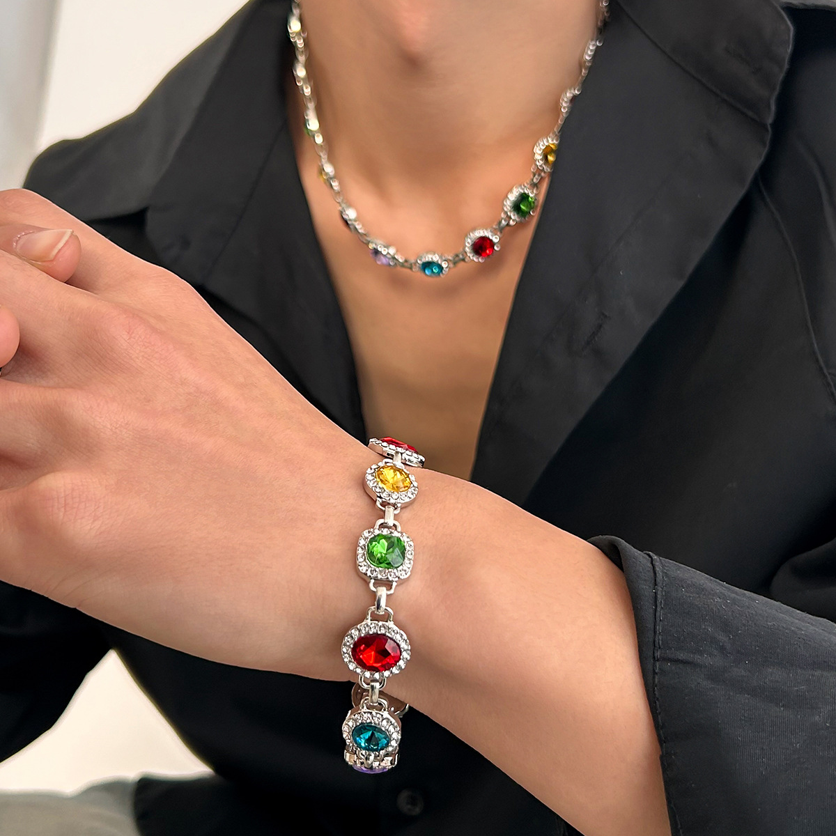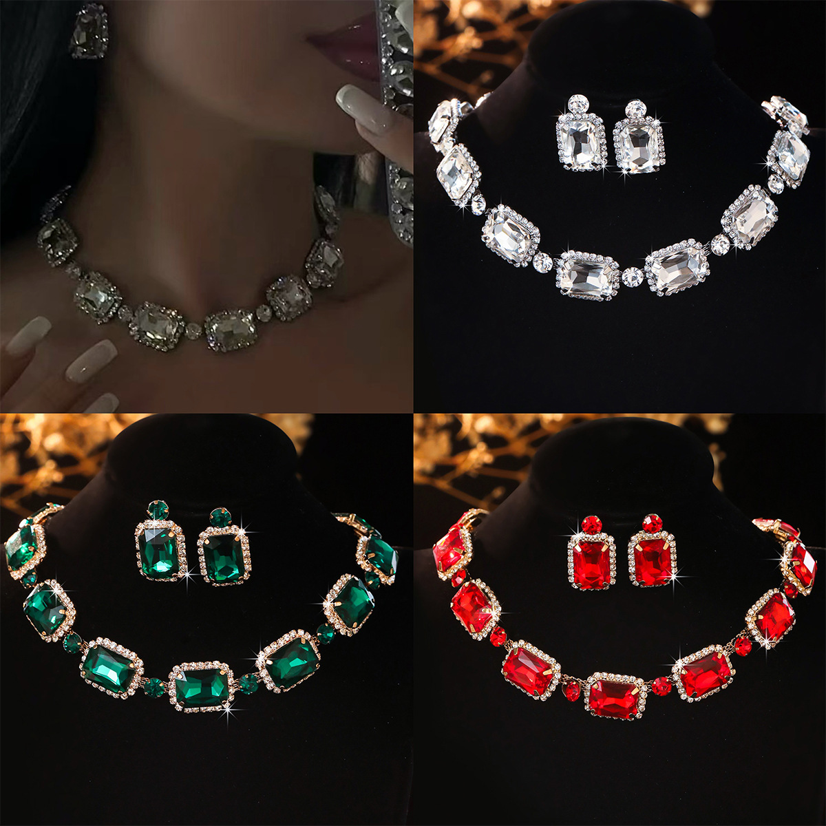Cross-Border Export New Trend European and American Exaggerated Rectangular Geometric Multi-Layered Colorful Crystal Necklace Earrings Set Accessories