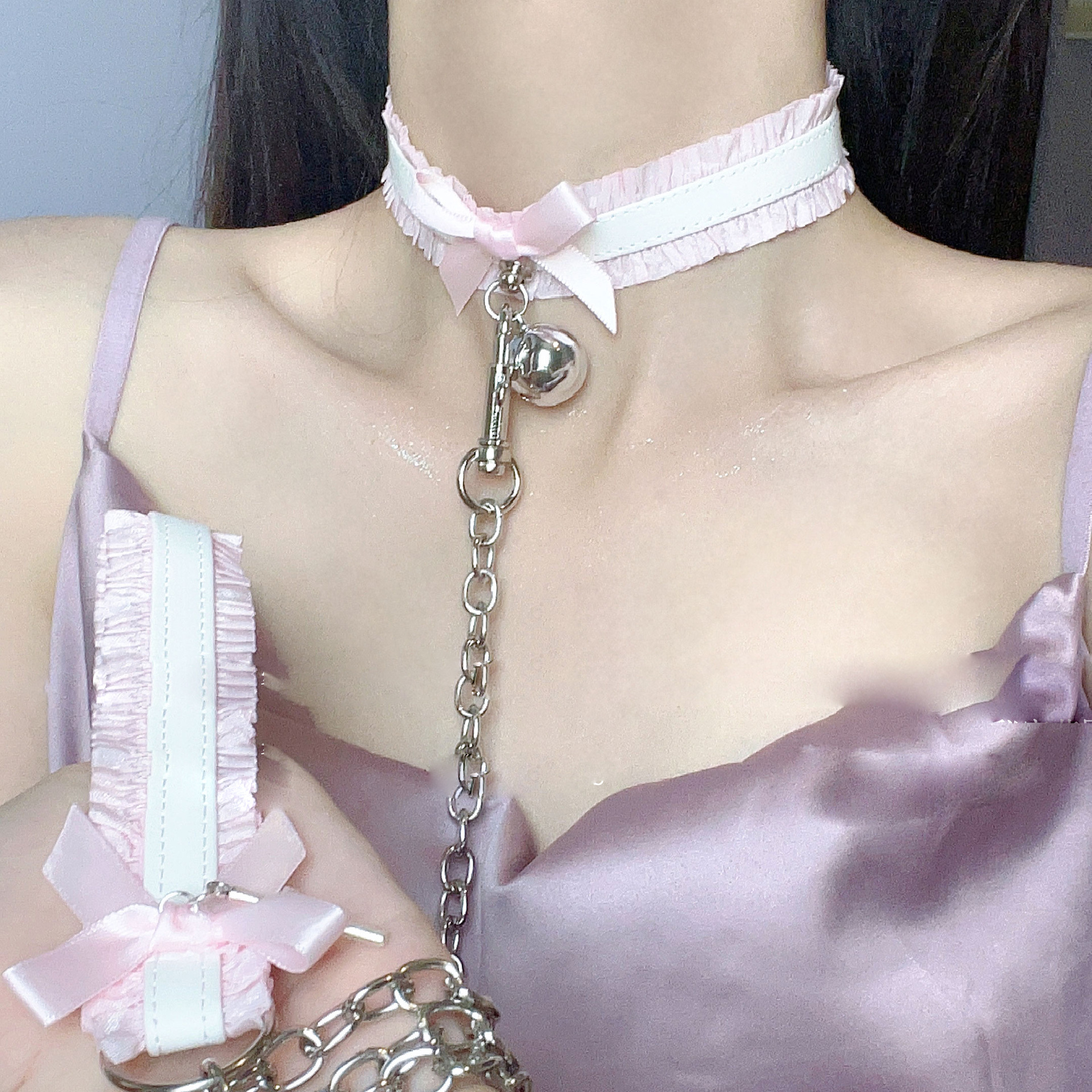 Girl's Pink Lotus Leaf Lace Leather Collar Bell Necklace Traction Rope Clavicle Chain Sweet Cool Style Design Sense Soft Girl