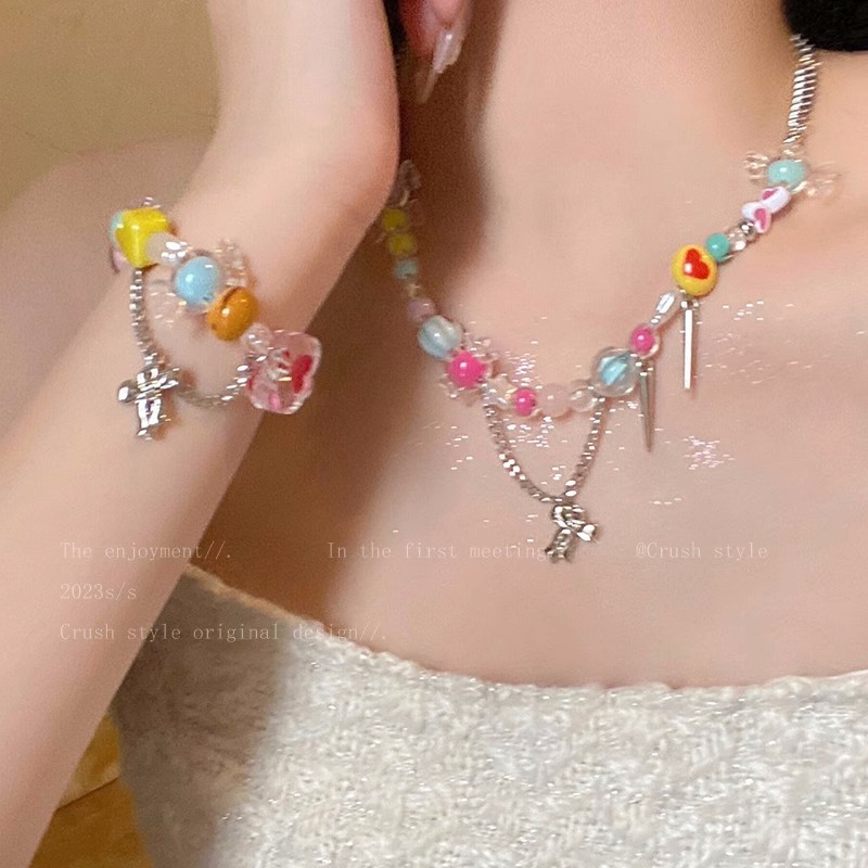 Korean Style Simple and Fashionable Candy-Colored Heart-Shaped Crystal Clavicle Chain Versatile Niche Heart Bow Zircon Necklace for Women