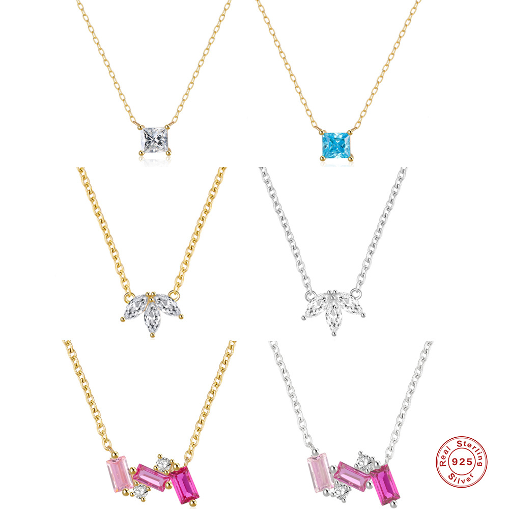 S925 Sterling Silver Square Four-Claw Marquise Colorful Diamond Clavicle Necklace European and American Elegant French Style Clavicle Chain