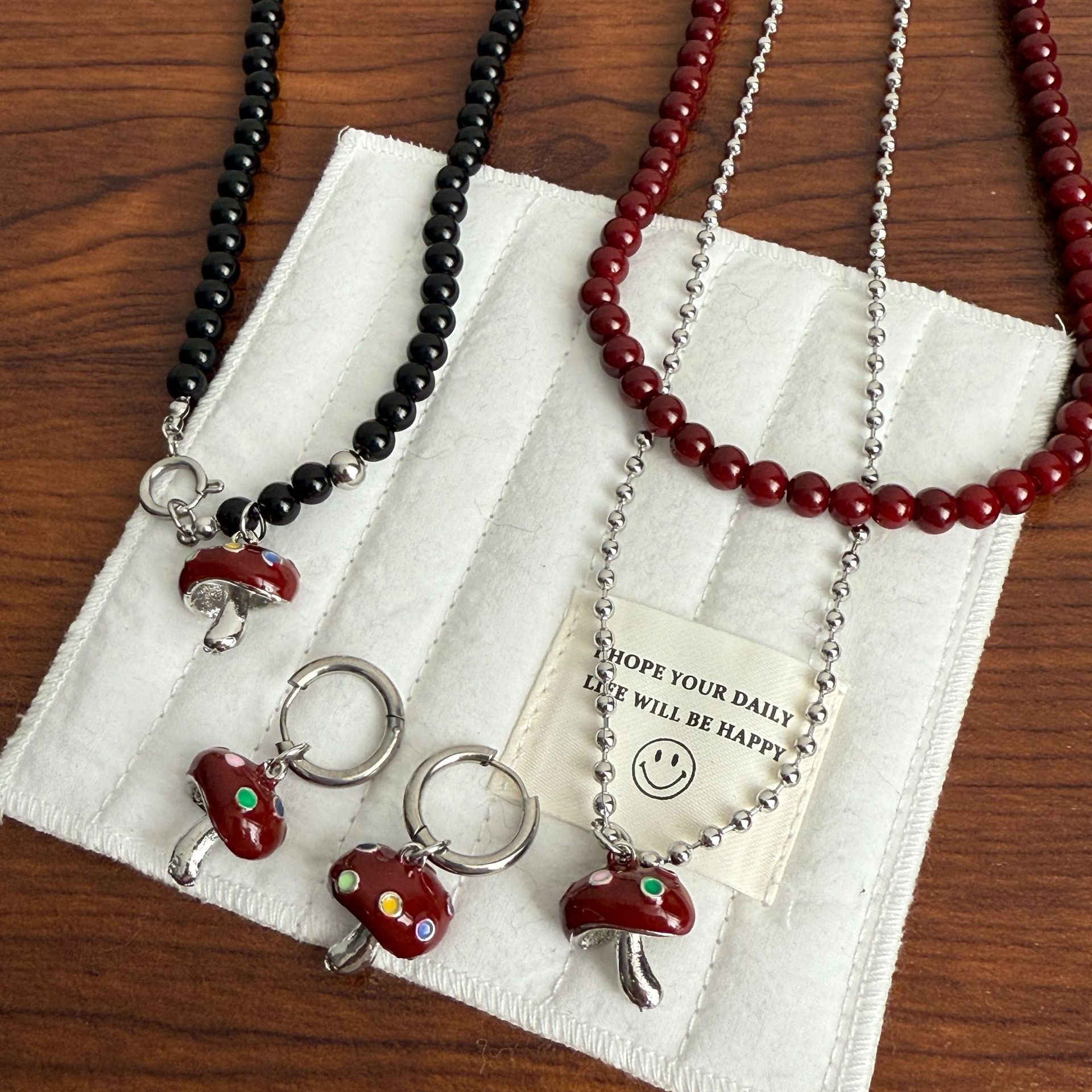Niche Design Sense Dropping Oil Color Mushroom Necklace Black wine red Beaded Simple Versatile Necklace Titanium Steel Ear Buckle