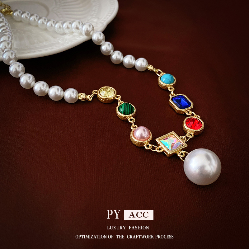 High-End Gold-Plated European and American Jewelry Fashion Pearl Colorful Zircon Multi-Element Multi-Pendant Necklace Simple for Women