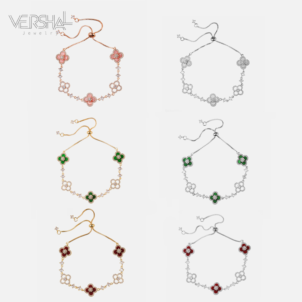 Popular Colorful Internet Celebrity Pink Lucky Four-Leaf Flower Sparkling Zircon Bracelet Copper Plated Real Gold Adjustable Pull Bracelet