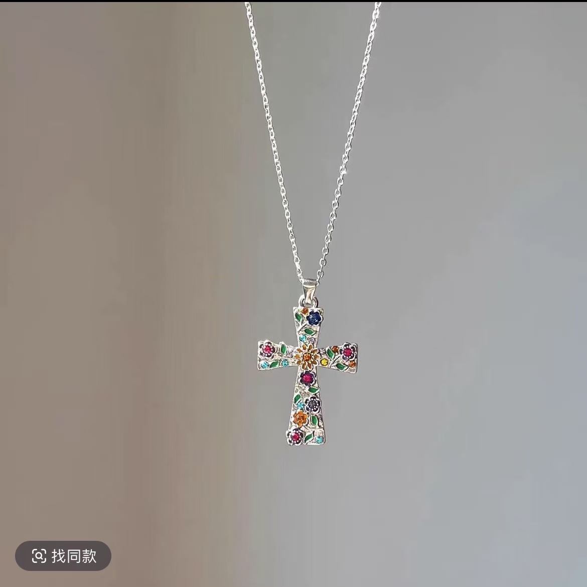 Cross-Border Popular Colorful Flower Cross Necklace for Women, Light Luxury Fashion European and American Small Plum Blossom Pendant, Personalized Clavicle Chain