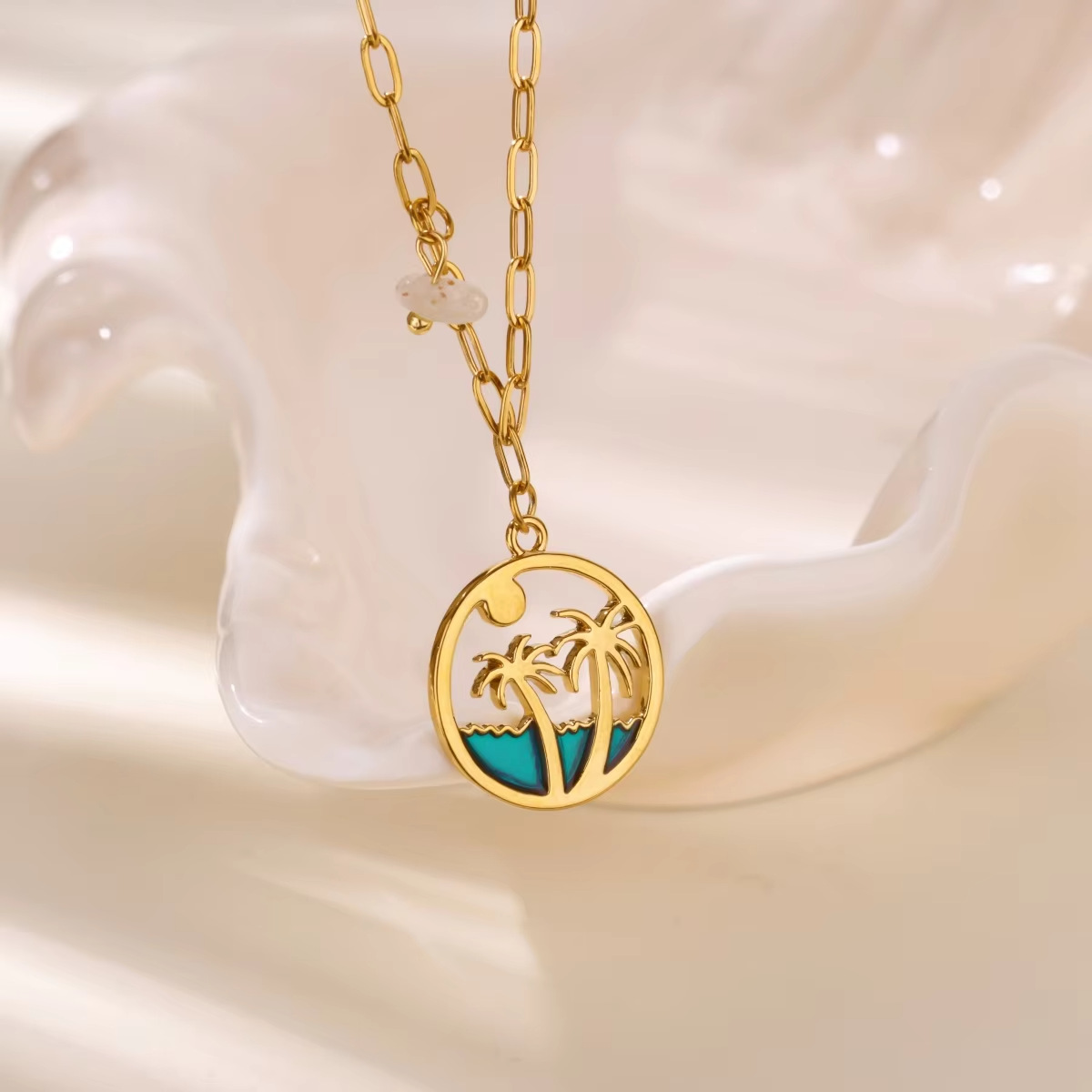 European and American Cross-Border Baroque Ins Style Stainless Steel Necklace Colorful Coconut Tree Natural Stone Accessible Luxury High-End Necklace for Women