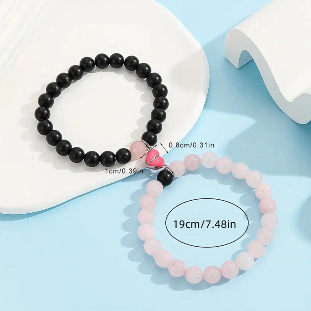 1 set of elegant handcrafted heart pendant couples bracelet, black and pink beaded fashion