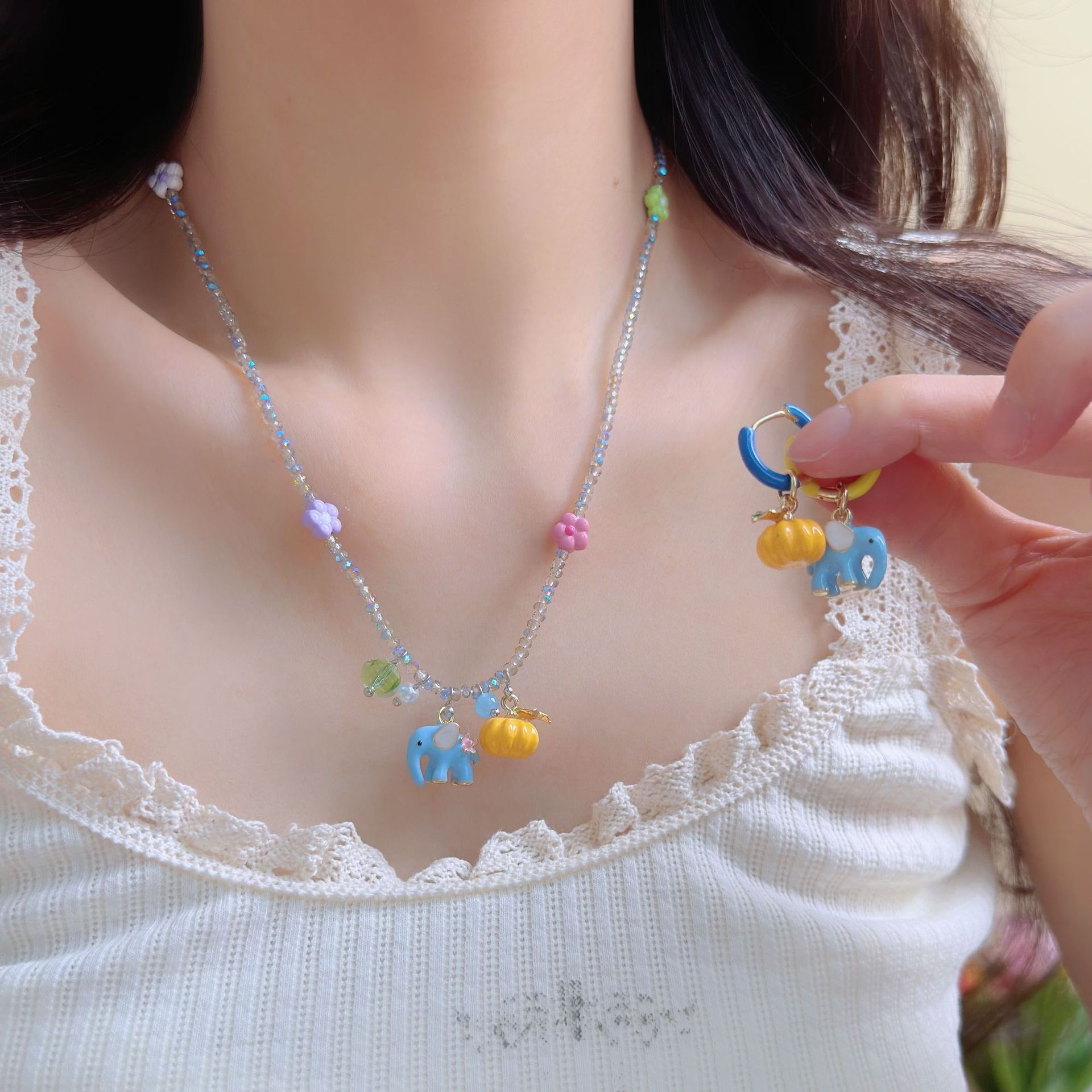 Colorful Drip Glaze Elephant Pumpkin Pendant Crystal Flower Beaded Necklace Earrings for Women Sweet Cute Ear Accessories Collarbone Chain