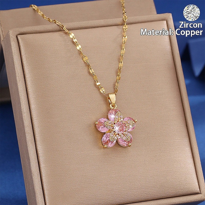 Necklace for Women Cross-Border Micro-Embellished Simple Rotating Flower Pink Pendant Clavicle Chain Full of Diamonds Light Luxury High-End Necklace