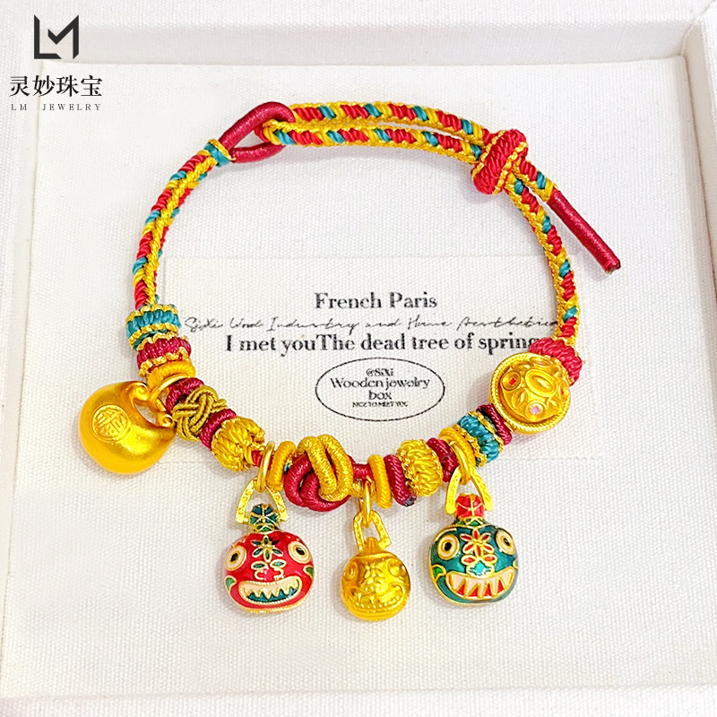 Ancient French Style Sand Gold Enamel Gold-Swallowing Beast Family of Three Colored Rope Bracelet with Fat Fortune Transfer Beads Braided Bracelet for Women