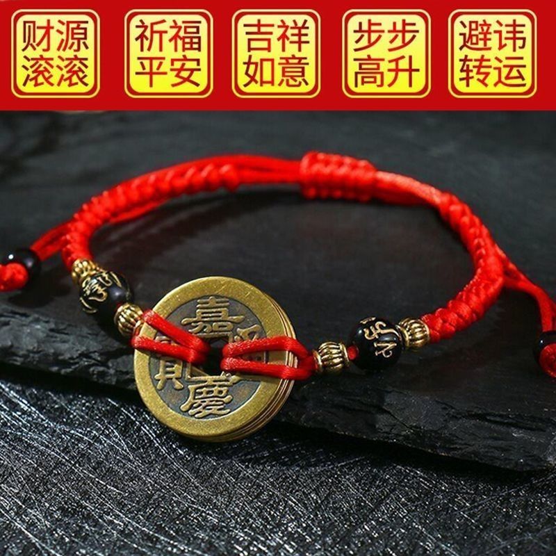 Five Emperors' Money Six-Word Mantra Bracelet and Anklet for Fortune and Protection in the Year of Birth, Red String for Men and Women, Copper Coin Braided Rope