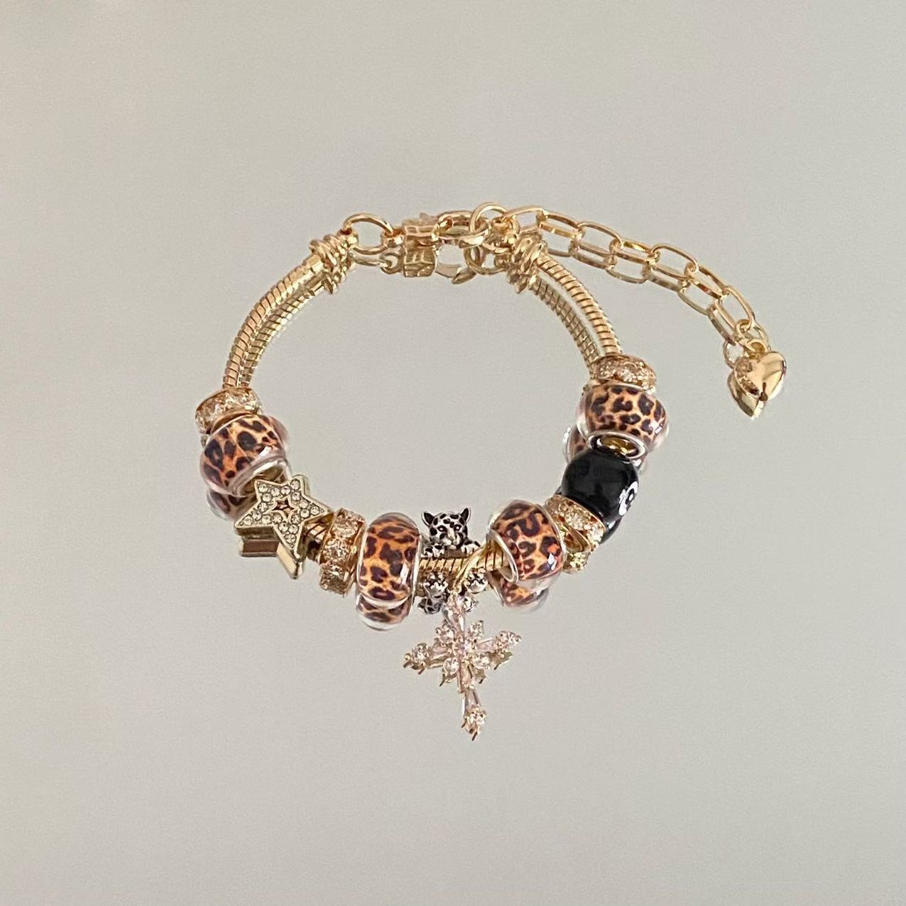Panjia Bracelet Cross-Border Popular DIY Beaded Bracelet for Women Copper Inlaid Zirconium Cross Leopard Print Beads Black Eight Fashion Jewelry