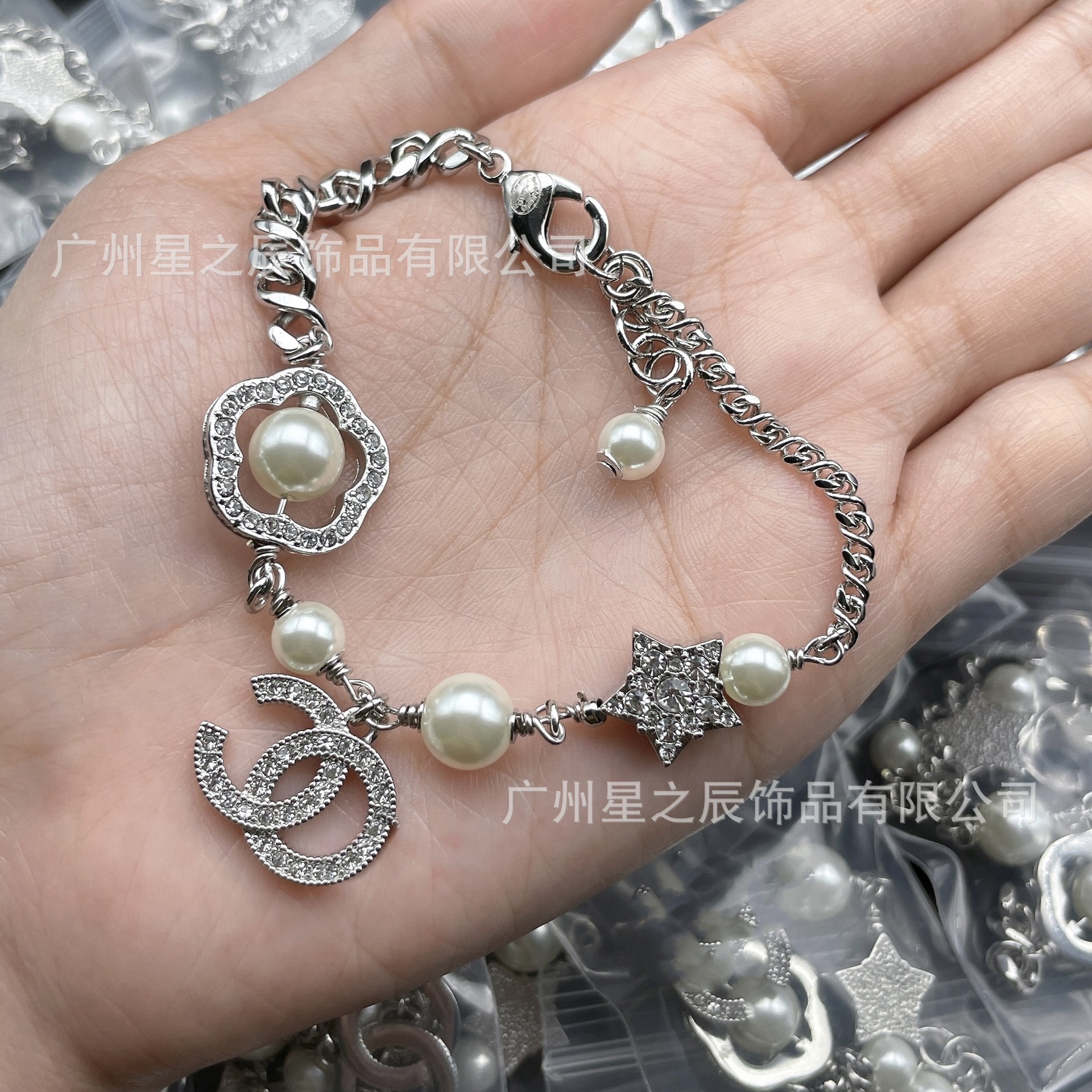 Real Shot of Xiangjia's Double C Pearl Camellia Bracelet with Label, Female Fragrance Grandma Star Full Diamond Bracelet Female Wholesale