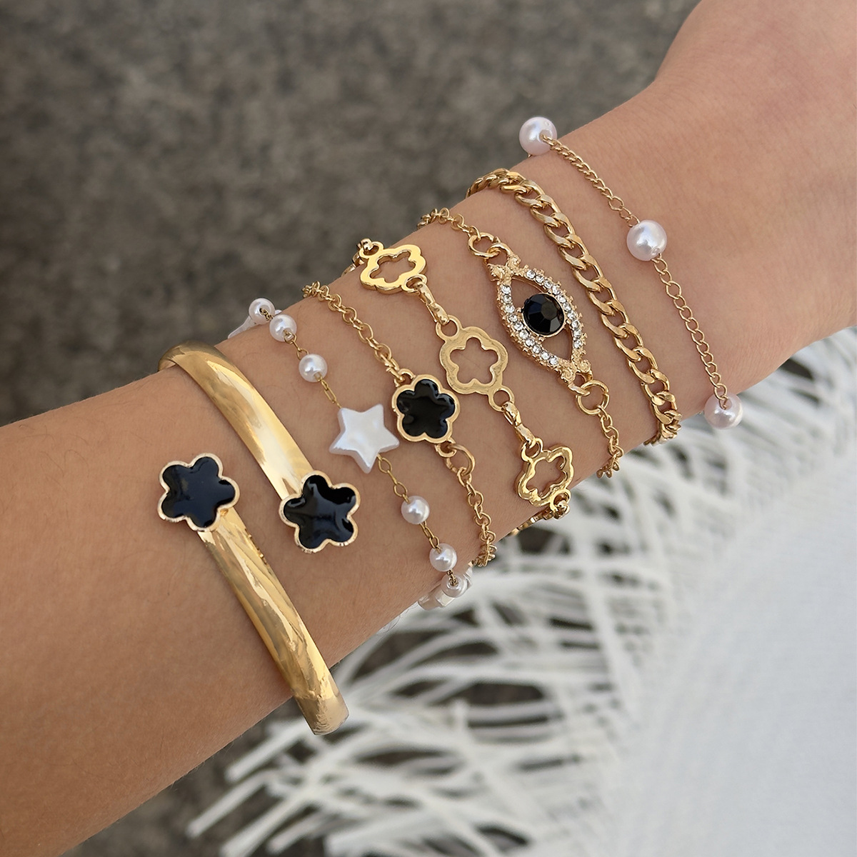 Amazon Cross-Border Fashion Flower Imitation Pearl Copper Bracelet Seven-Piece Set Design with Eye-Studded Diamond Bracelet Wholesale