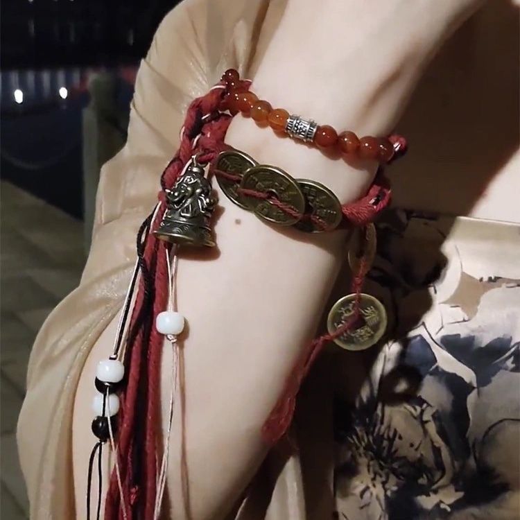 Firey Hand Rope Xizang Style Mountain Spirit Copper Coin Flower Bracelet Chinese Style Bell Tassel Ancient Style Handmade Vintage Jewelry