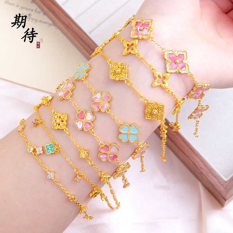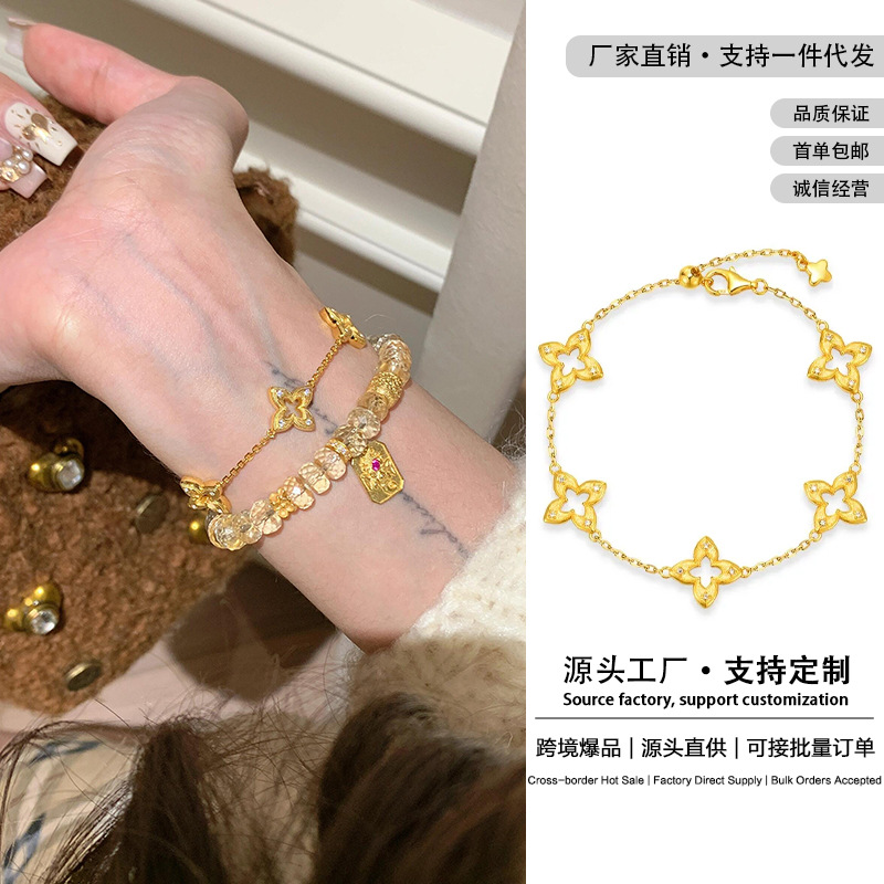 Looking Forward to the Ancient Method of Sand Gold That Will Not Fade for a Long Time, Four-Leaf Clover Diamond Bracelet, Fashionable and Charming Hand Jewelry, European and American Style Five-Flower Bracelet