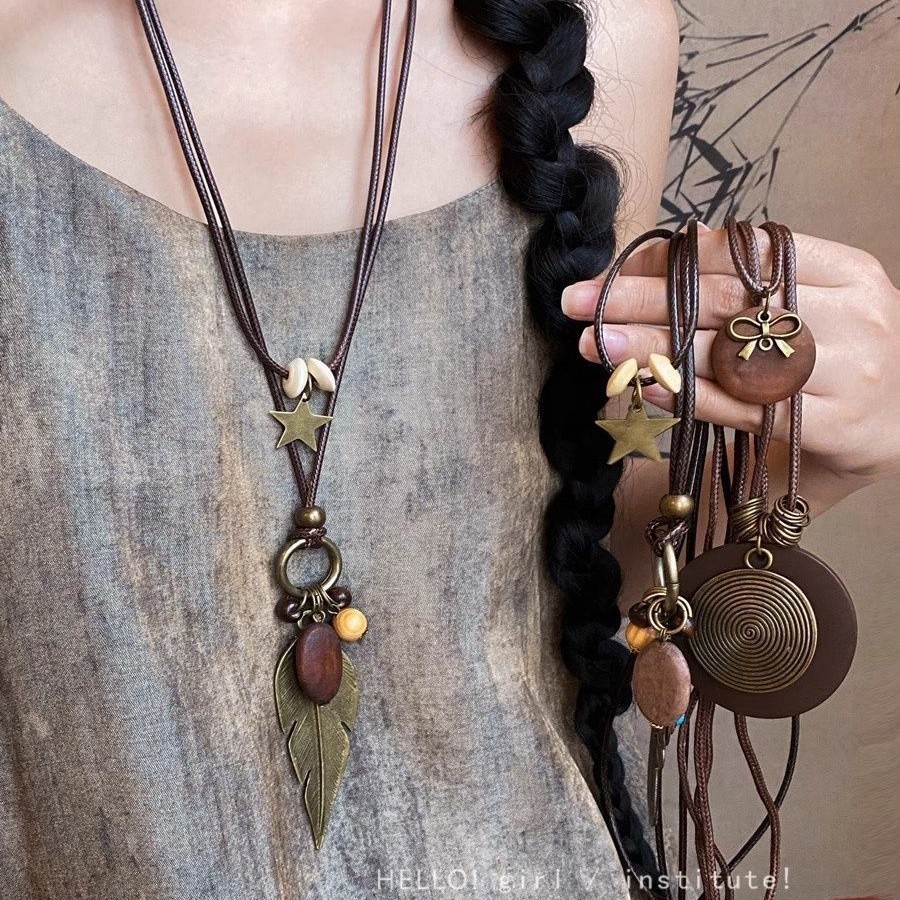 New Chinese Zen Bronze Feather Necklace Women's Bohemian Ethnic Style Double Layer Long Sweater Chain Accessories