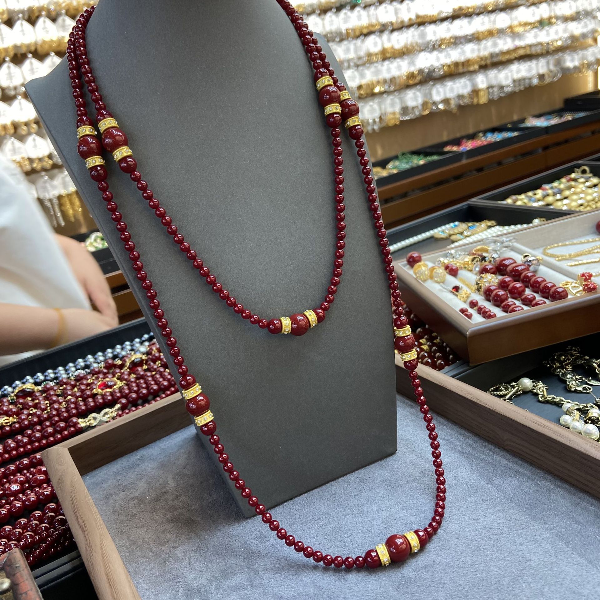 Vintage Light Luxury 5m-12m Angora Red Beaded Super Long Necklace Diamond-encrusted Brass Beaded Autumn and Winter sweater chain