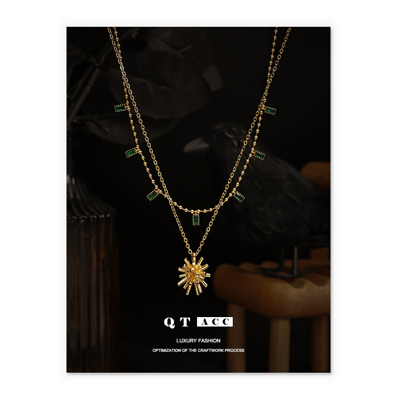 Brass plated 18K real gold European and American personality fashion style emerald zircon with flower pendant necklace necklace for women