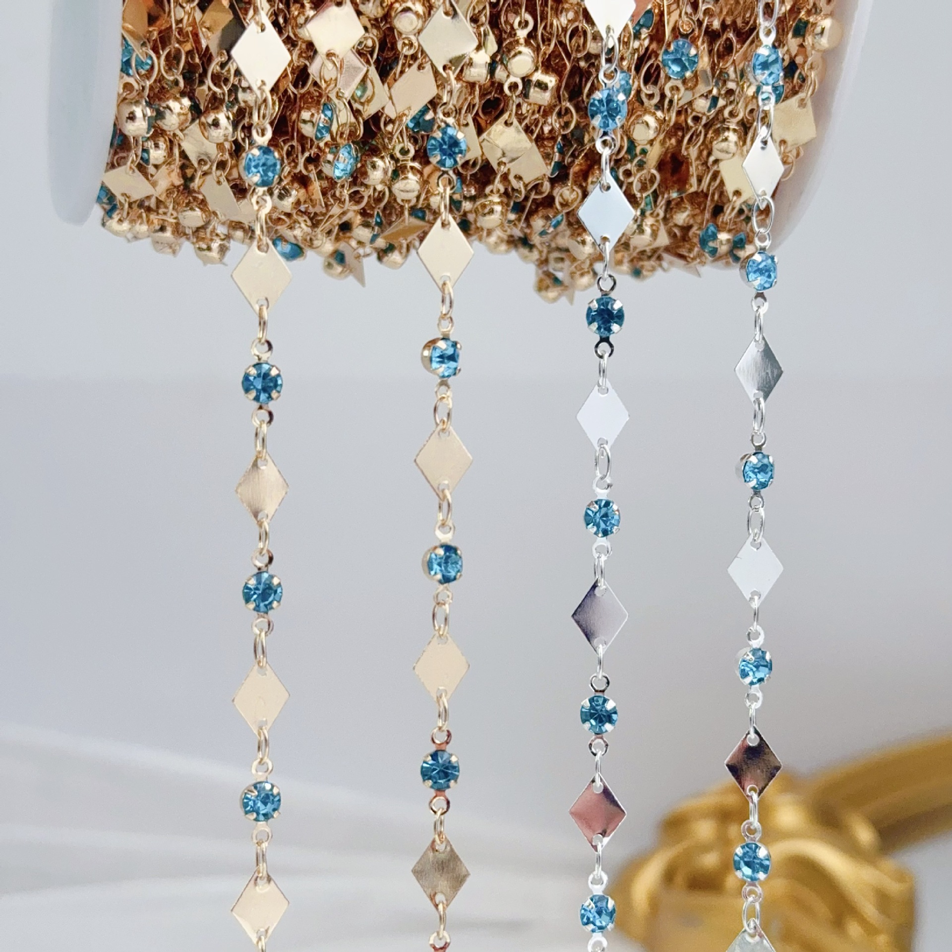 Ice Blue DIY Chain Rhombus Piece Plus Lake Blue Diamond Chain Color-Preserving Handmade Copper Chain Ancient Style Hair Accessories Tassel Jewelry Accessories
