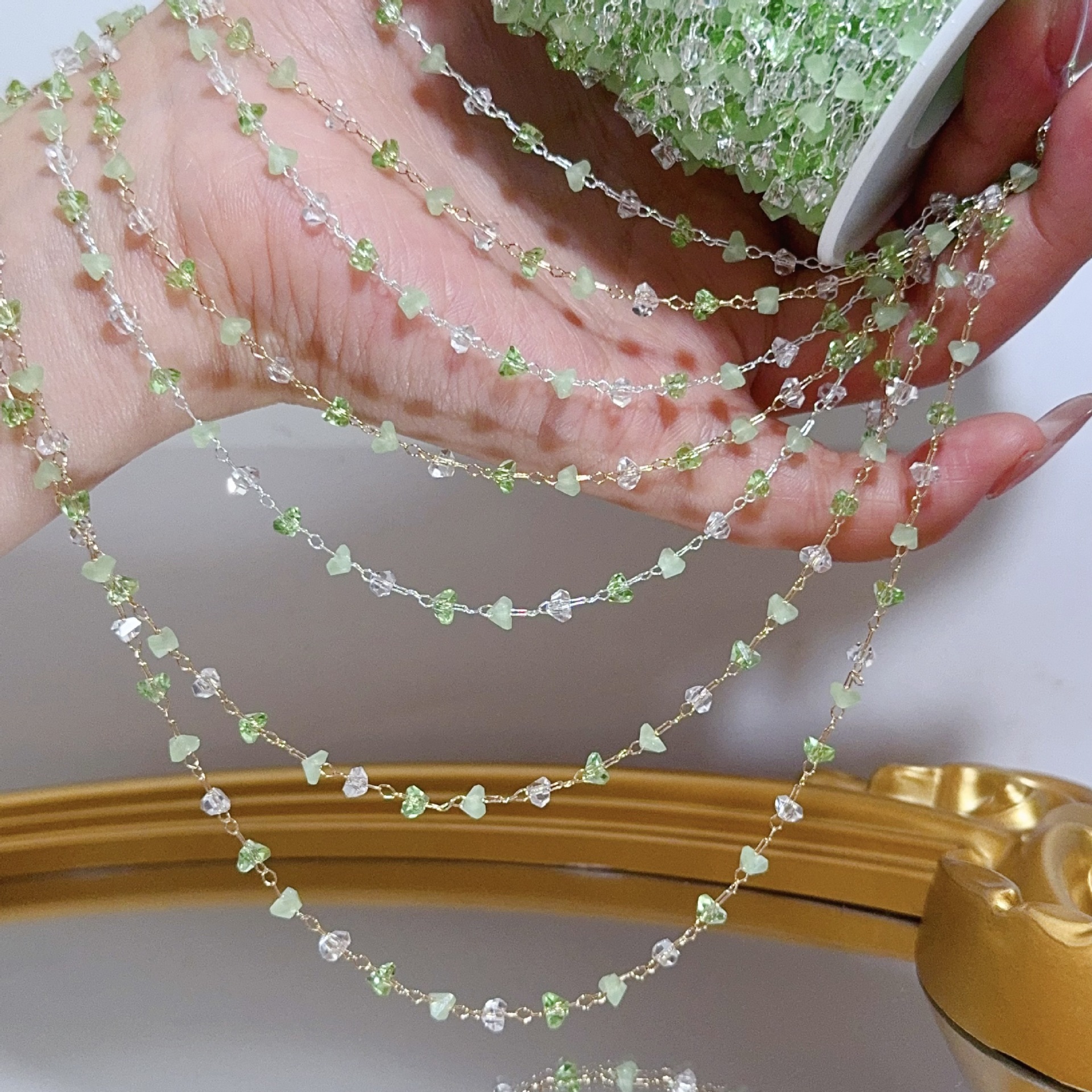 Golden Branches and Jade Leaves~Diy Chain with Floral Straight Rod Pendant, Hollow Leaf Drill Chain, High Color Retention Handmade Copper Chain Jewelry Accessories