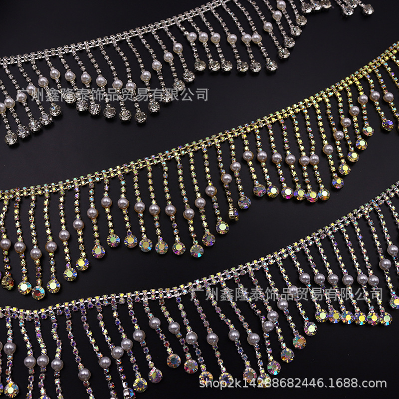 Western Style Copper Chain Welded with Colorful Rhinestones and Pearl Tassels Barcode Wedding Dress Xiuhe Clothing Decoration DIY Accessories