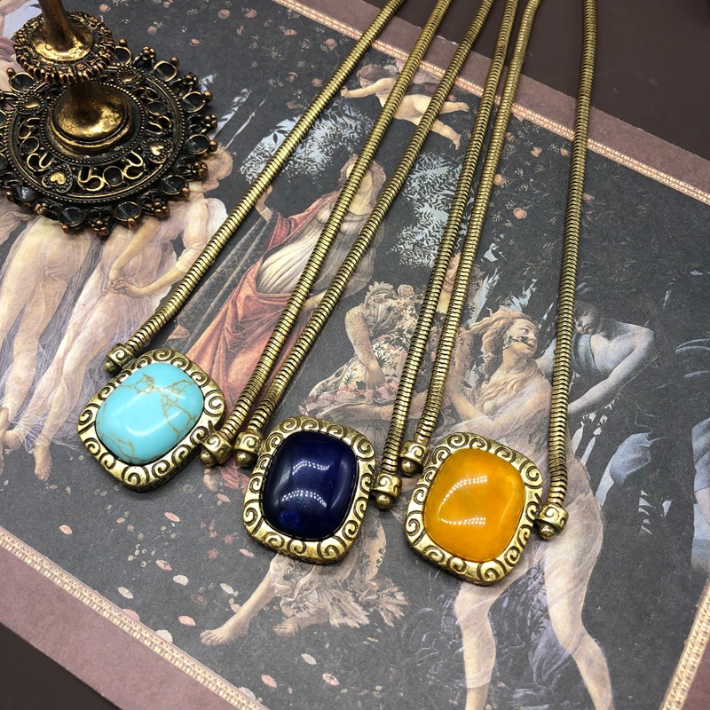 Copper Plated Old Gold Retro Style Return Lapis Lapis Turquoise Topaz Inlaid Necklace Elegant All-match Wool Chain