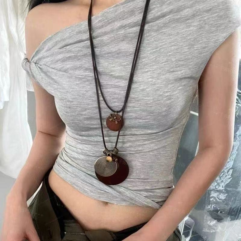 Ethnic style Mori retro wooden design sweater chain bohemian style multi-layer stacked holiday style long necklace