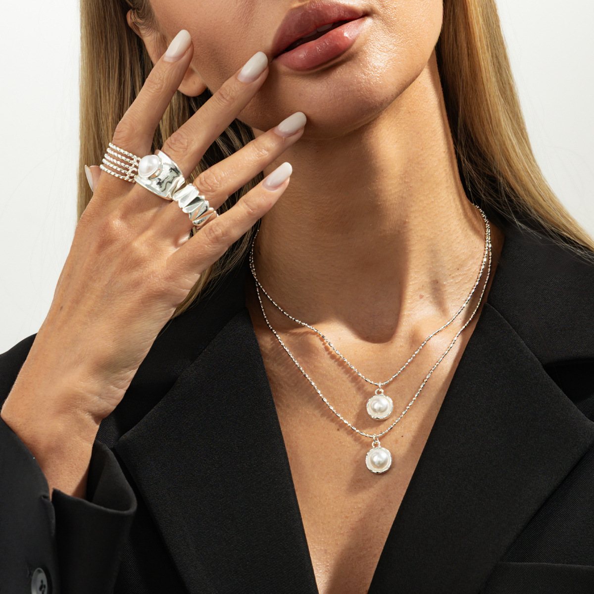 European and American Cross-Border Jewelry Design Imitation Pearl Acrylic Pendant Necklace Ins Style Simple Double-Layer Thin Clavicle Chain