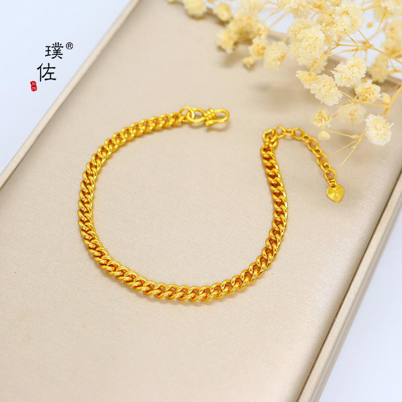 24K Bright Gold Horsewhip Bracelet from Puzuo Gold Store, Simple and Versatile Cuban Chain, Plain Chain, Thin Side Chain for Girlfriend