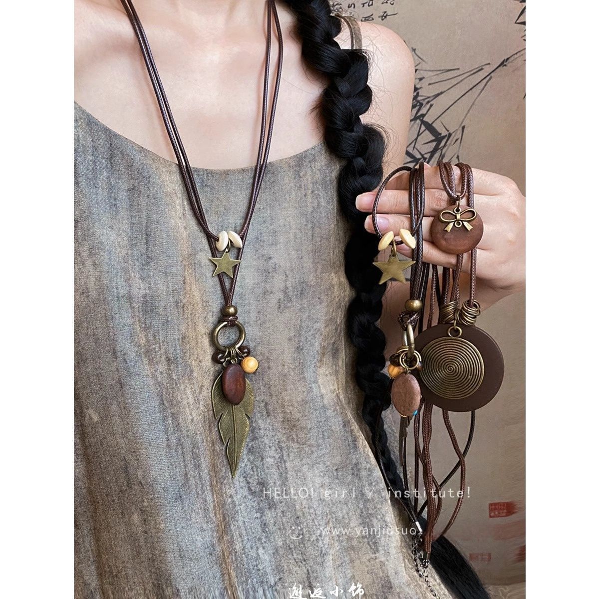 New Chinese Zen Bronze Feather Necklace Women's Bohemian Ethnic Style Double Layer Long Sweater Chain Accessories