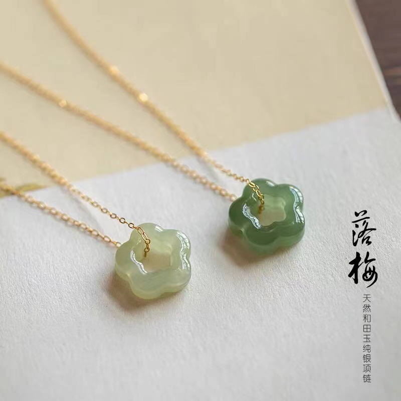 Hotan Jade Plum Blossom Pendant Necklace for Women DIY Hollow Design Ancient Style Clavicle Chain Green Jasper Pendant Dropshipping