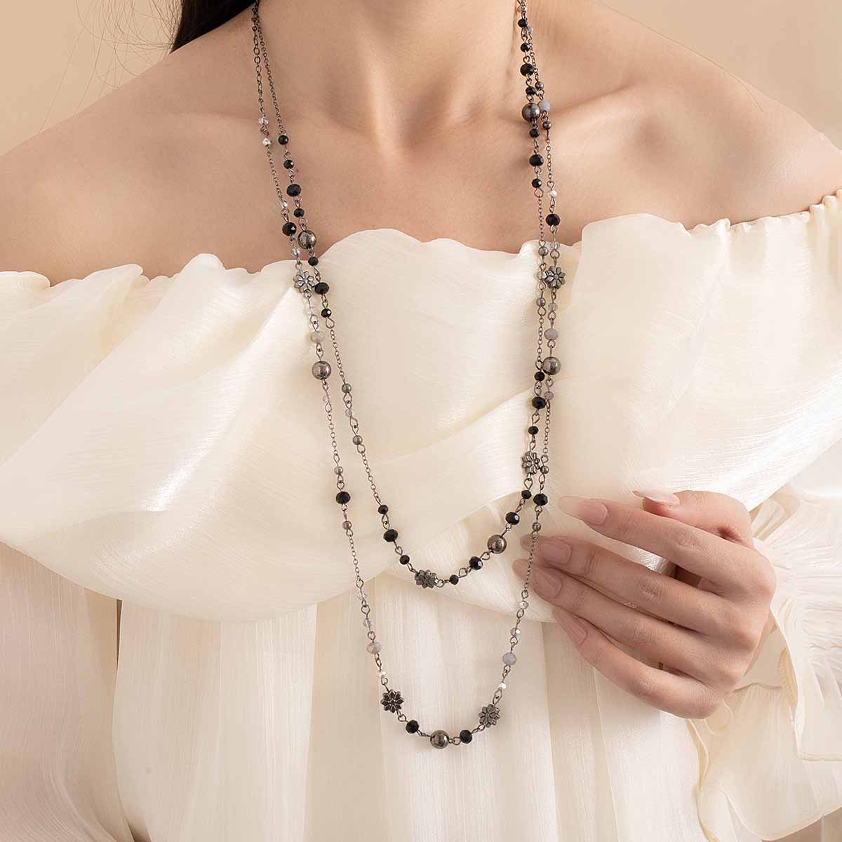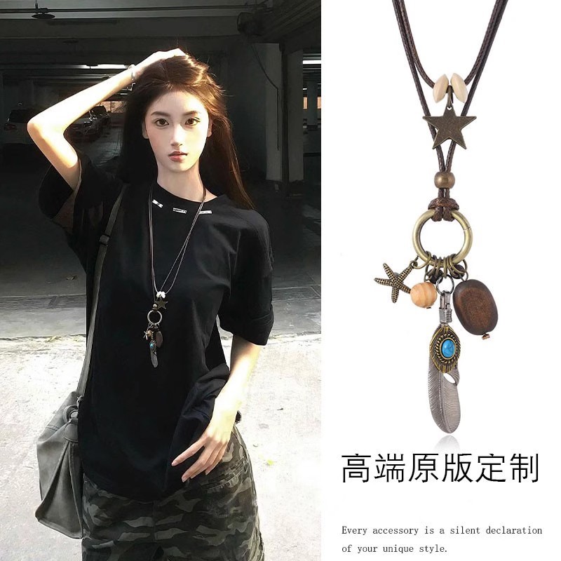 Sweet Cool Spice Girl Bohemian Long Necklace Vintage Distressed Double-Layer Flower Beaded Necklace Distinctive Niche Necklace