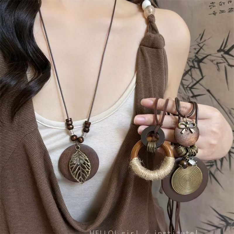 New Chinese Style Long Leaf Braided Rope Necklace Women's Zen Style Fashion Versatile Pendant Sweater Chain Accessories