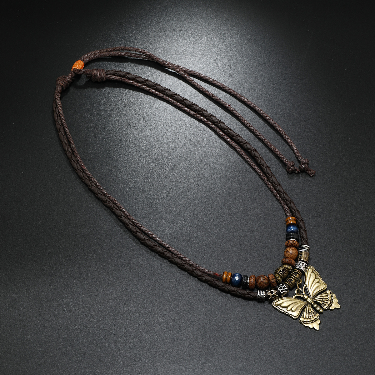 Cross-Border Retro Ethnic Style Alloy Butterfly Pendant Leather Rope Wooden Beads Beaded Braided Double-Layer Men's Necklace