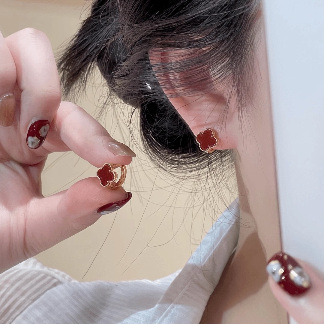 Exquisite and High-End Burgundy Four-Leaf Clover Earrings for Women, Autumn and Winter Versatile Earrings, Niche Personalized Design Earrings