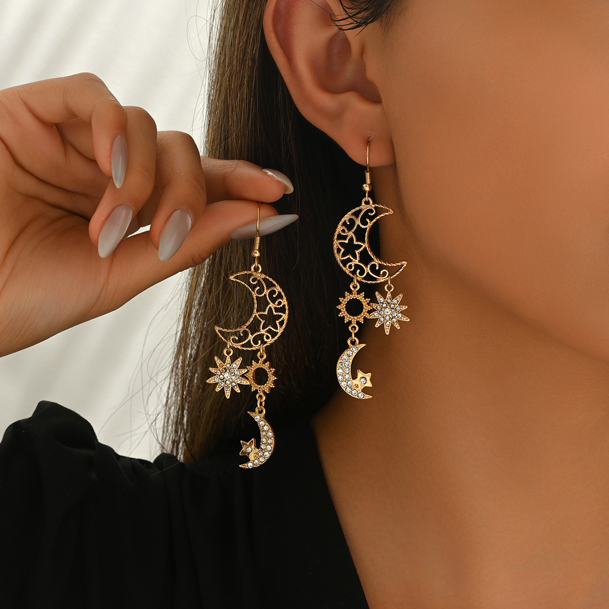 European and American Cross-Border Sun Moon Star Rhinestone Circle Pendant Long Tassel Women's Earrings Metal High-End Women