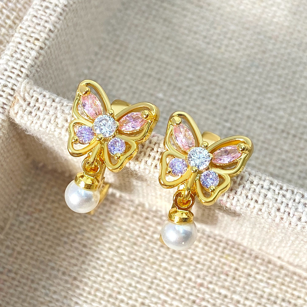 Butterfly Golden Thai Earrings Classic Super Fairy Colored Zircon Pearl Earrings for Women Summer Sweet and Light Luxurious Temperament