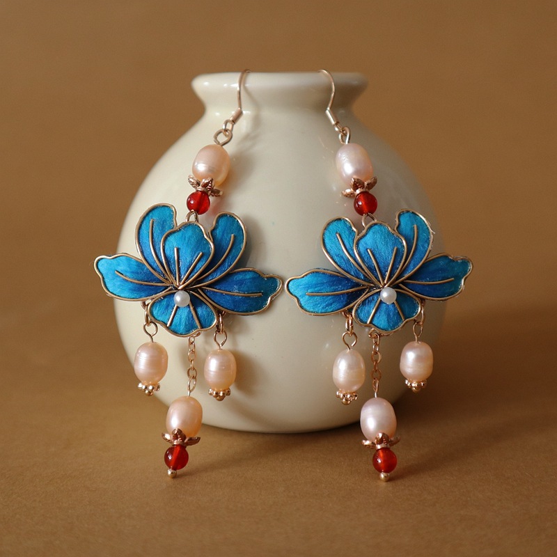Non-heritage Gradient Flower Earrings Chinese-style Horse-faced Skirt Petal New Year Accessories Freshwater Pearl Elegant Earrings Classical