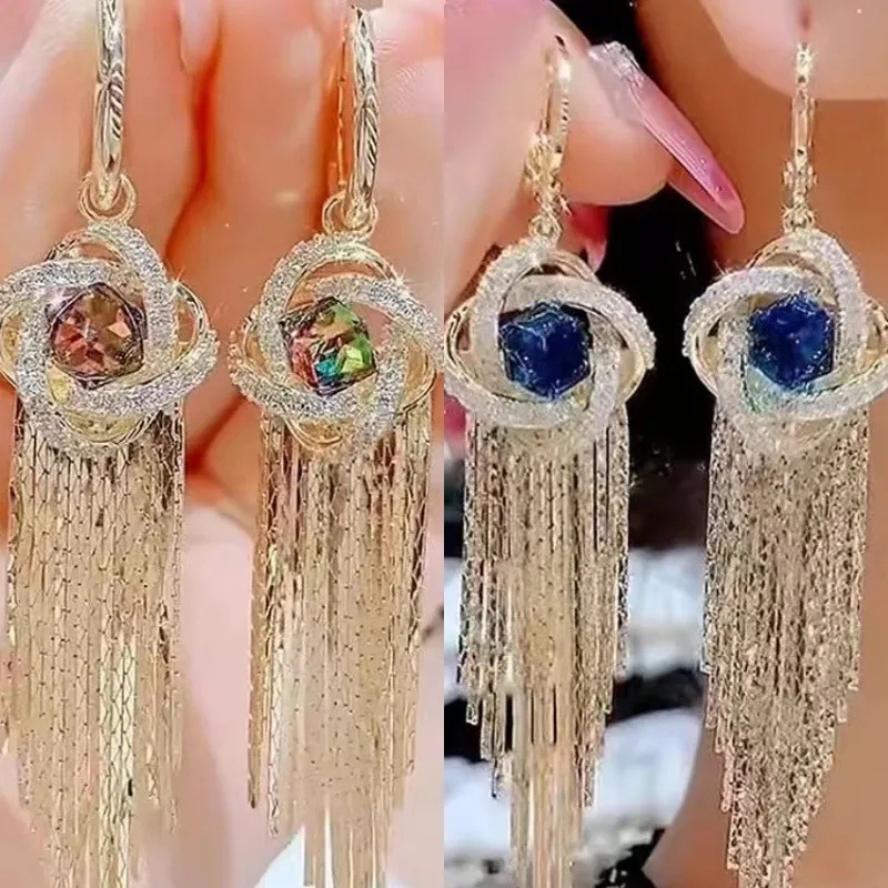 New Unique Exaggerated Design Zircon Wrapped Blue Rubik's Cube Tassel Earrings Elegant Internet Celebrity Hot Style Trendy Earrings