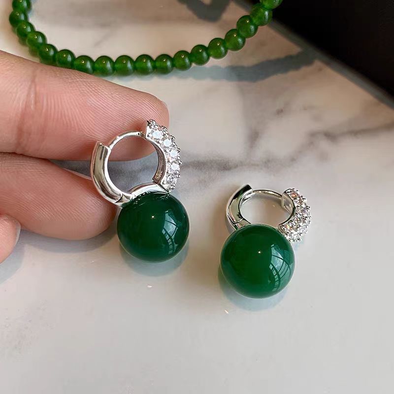 New Chinese-Style Retro Natural Green Chalcedony Earrings for Women, Summer Light Luxury Niche Design, High-End Temperament, Versatile Ear Clips and Earrings