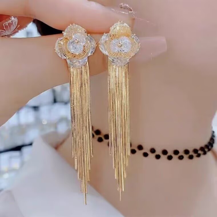 Gold Diamond-Studded Four-Leaf Flower Tassel Earrings for Women, Long Exaggerated Accessories with a Sense of Design, Korean and Japanese Style Earrings Trend