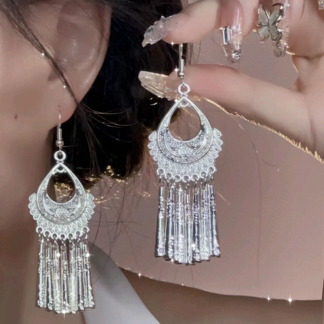 Imitation silver Miao earrings Bohemian long leaf tassel minority tourist attractions earrings earrings