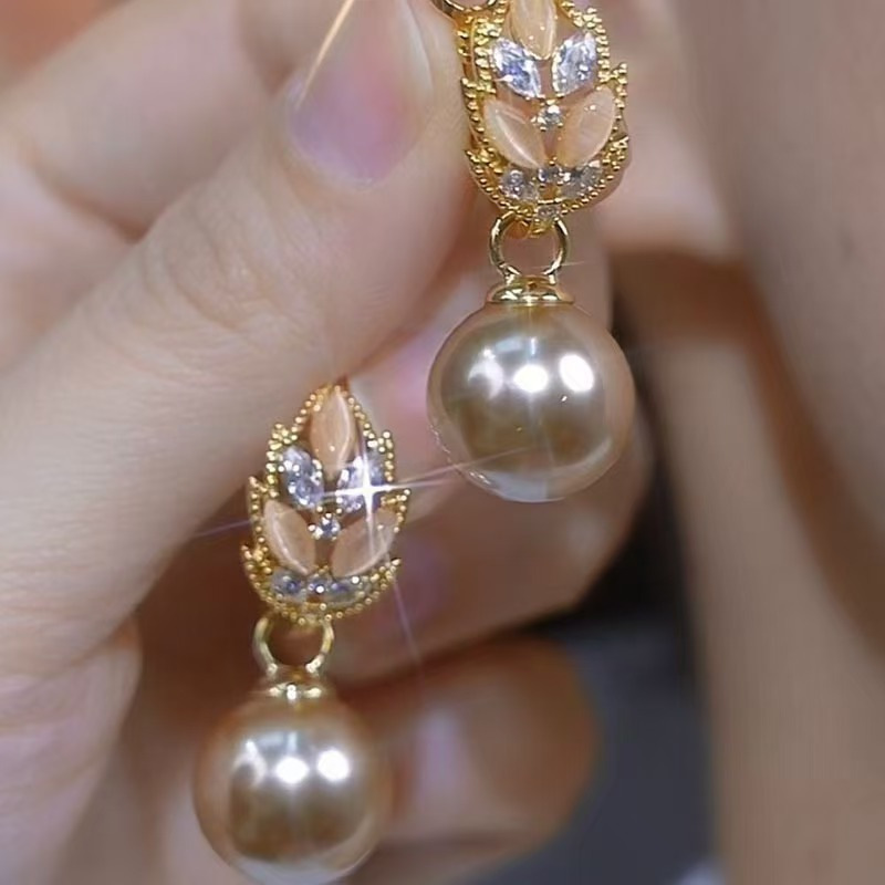 New Full Diamond Leaf Zircon Champagne Color Bead Earrings for Women, Light Luxury, High-End Fashion Versatile Ear Cuffs