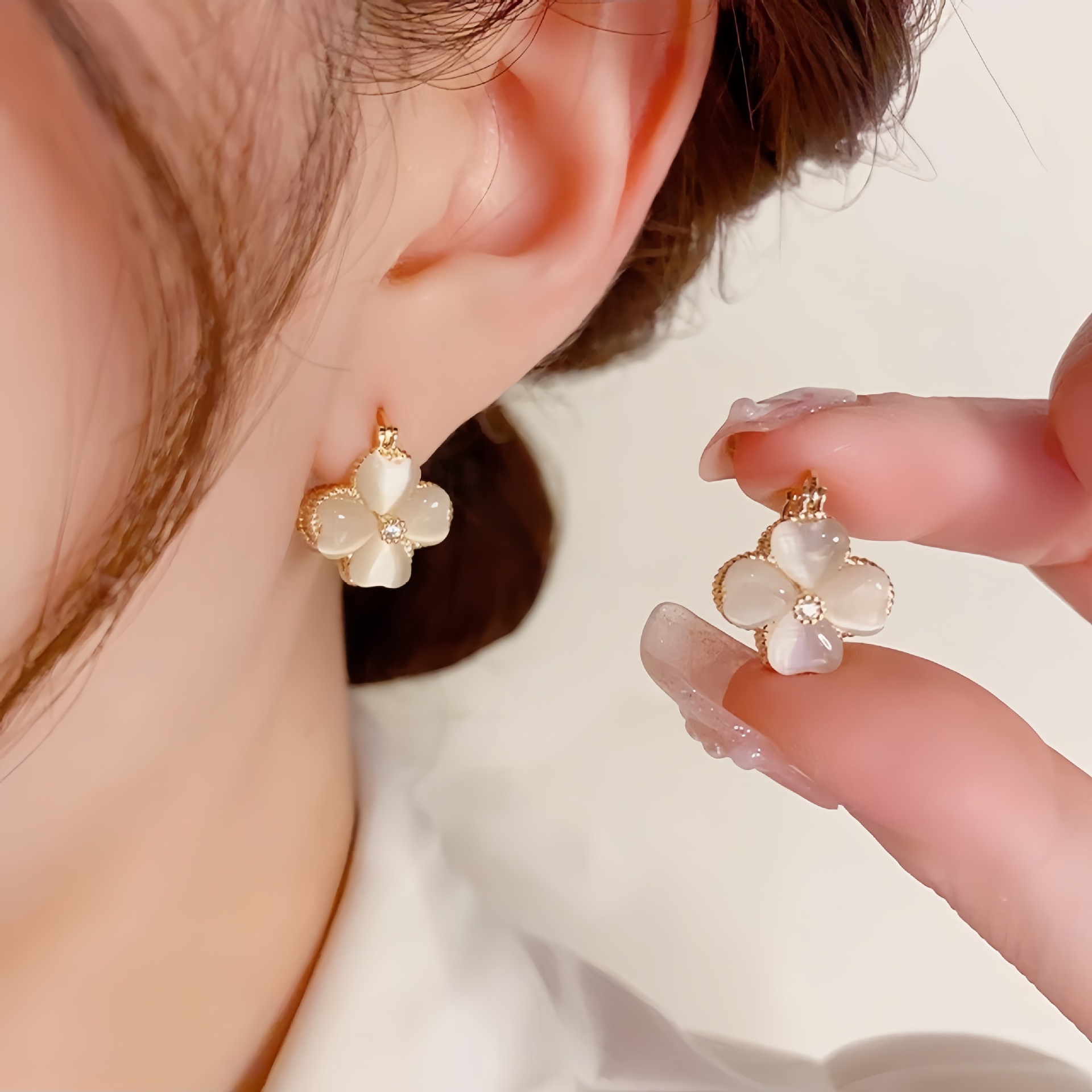 Forest-Style Double-Sided Four-Leaf Cat's Eye Flower Earrings for Women, Light Luxury, High-End Temperament Earrings, Simple Daily Earrings