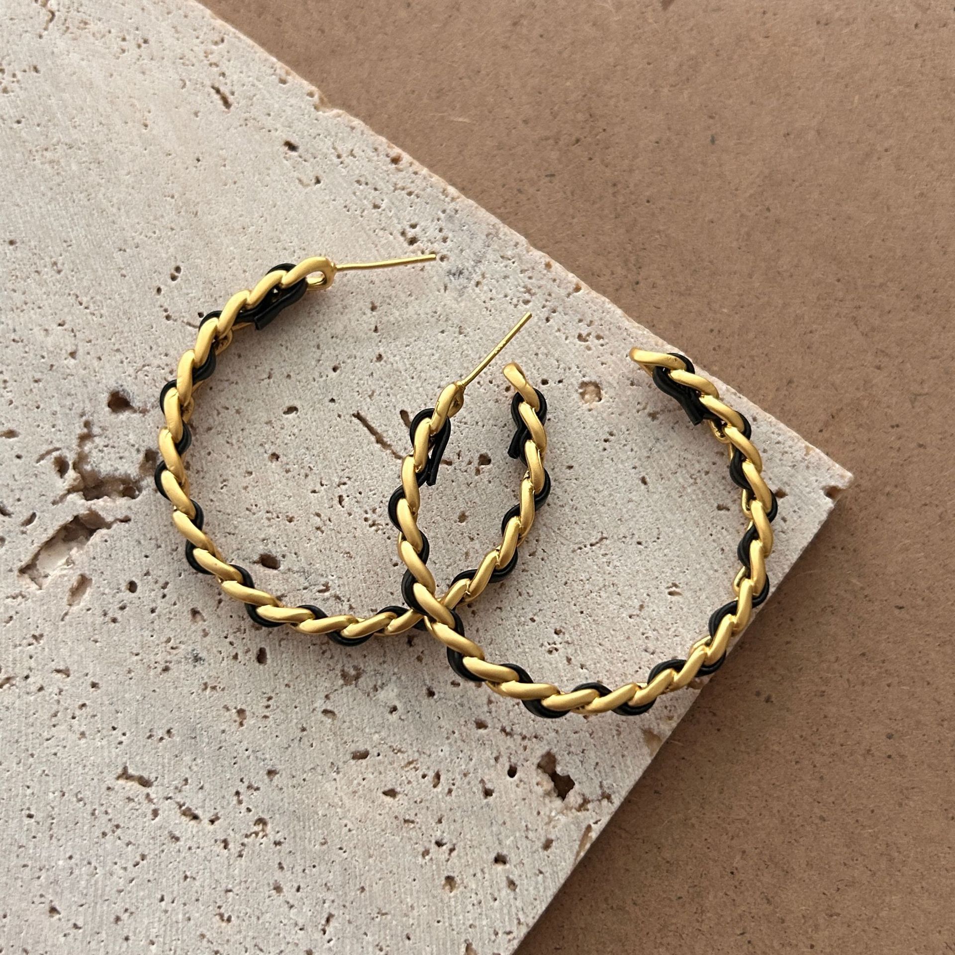 Black Leather Metal Braided Large Circle Earrings for Women Niche Design Earrings High-End C-Shaped Elegant Exaggerated Earrings