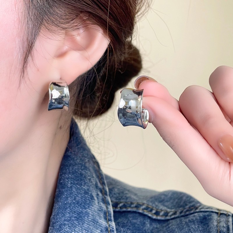 Matsunobu Ena's Same Style C-Shaped Wide Earrings Japanese Style Asymmetrical High-End Metal Hoop Earrings for Women