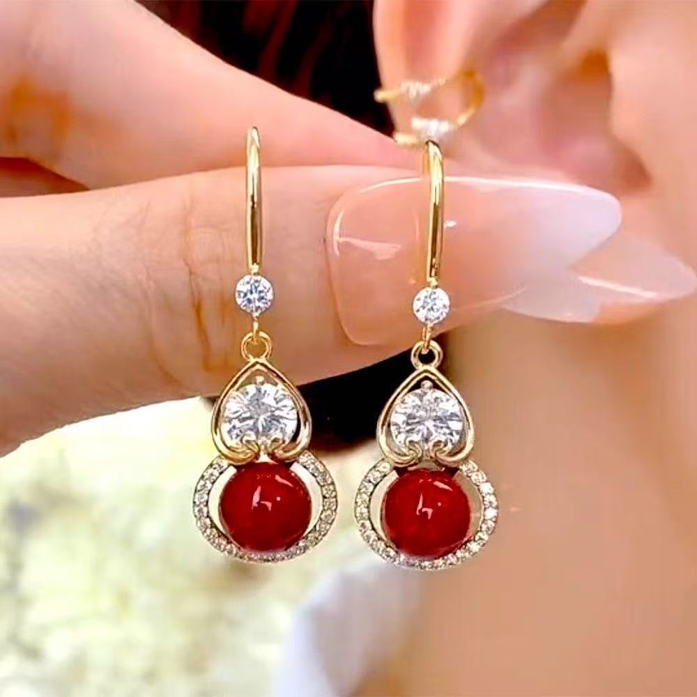 2025 New Chinese Style Retro Red Pearl Diamond Gourd Zircon Earrings Women's High-End Festive Earrings