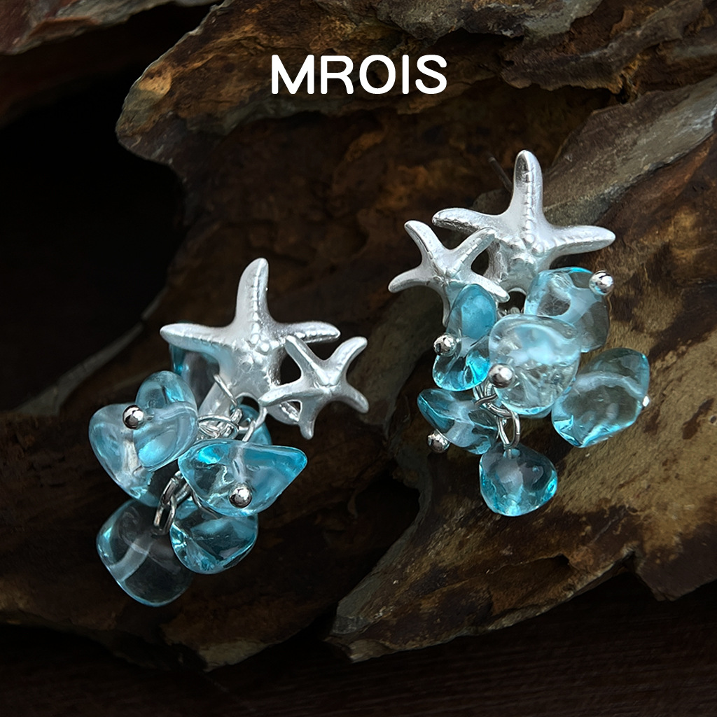 Ice Blue Starfish~Original Thick Plated Matte Silver Blue Gravel Tassel Starfish Earrings Niche Design Fresh Earrings