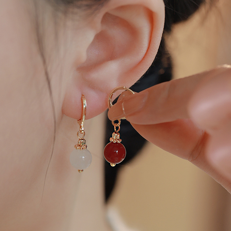 Minsheng Hetian Jade Earrings Niche Design Gold Silk White Jade Red Agate New Chinese High-grade Earrings Women Ins