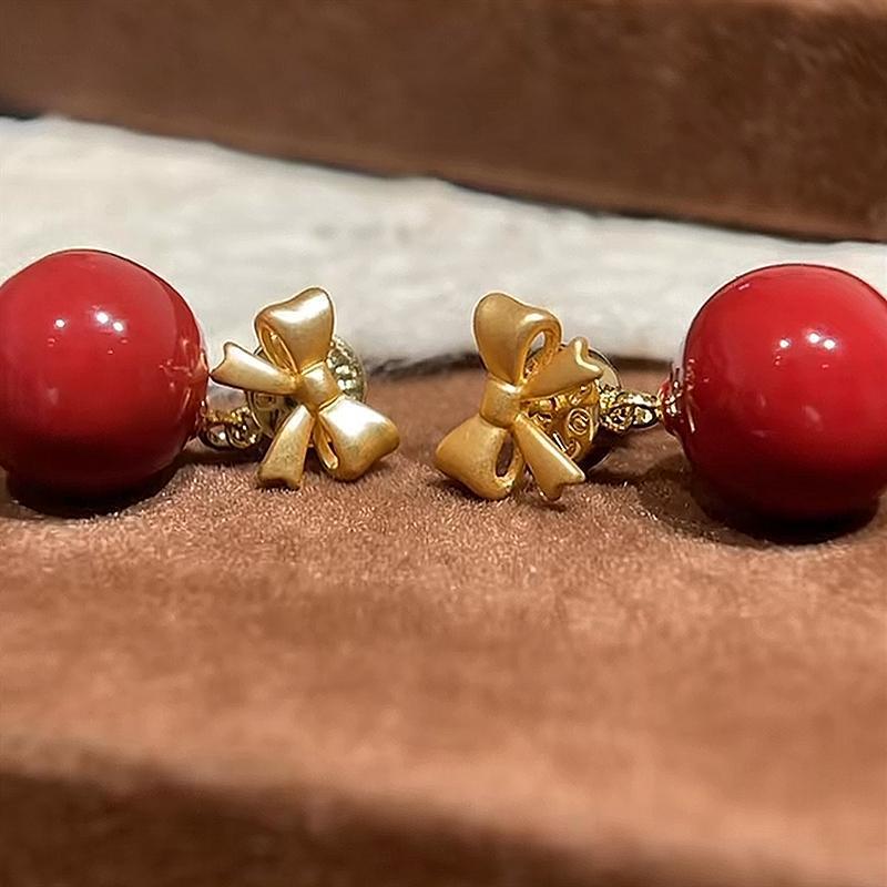 Vintage Golden Bow wine red Pearl Earrings Simple All-match Earrings Silver Pin Earrings All-match Temperament Cross-border